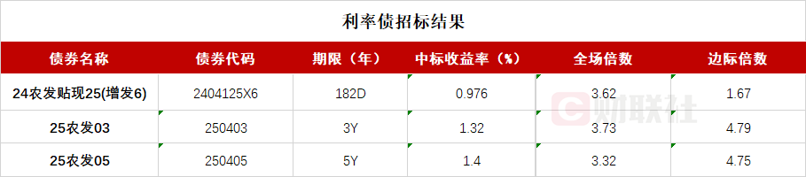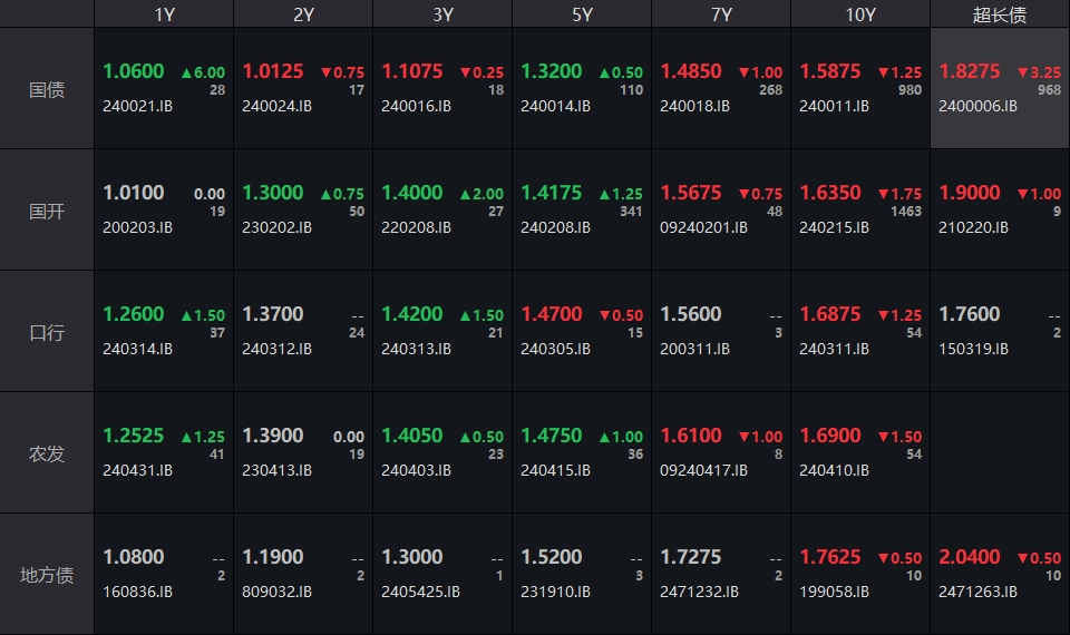银行间主要利率债收益率方面,截至下午16:30,10年期国债活跃券240011收益率报1.5875%,30年期国债活跃券2400006收益率报1.8275%,10年期国开活跃券240215收益率报1.635%。