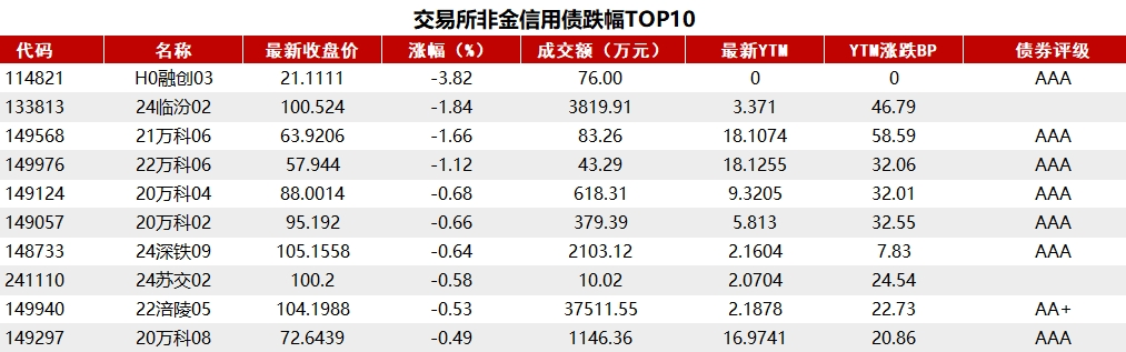 据Choice 数据统计显示,今日交易所市场非金信用债跌幅排行前五的分别是:H0融创03、24临汾02、21万科06、22万科06、20万科04。具体如下: