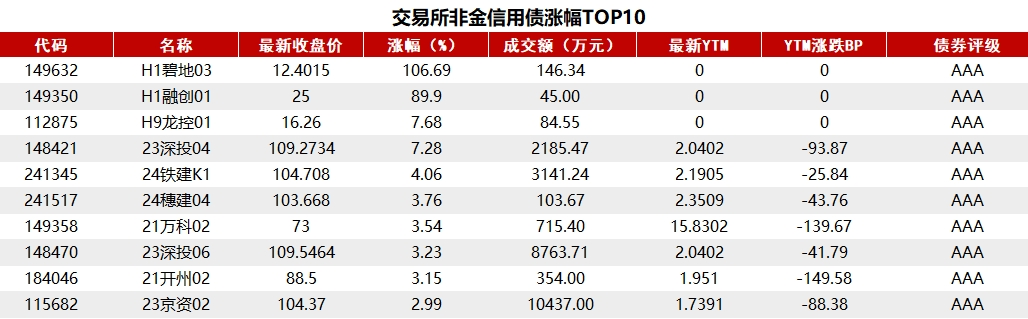 据Choice 数据统计显示,今日交易所市场非金信用债涨幅排行前五的分别是:H1碧地03、H1融创01、H9龙控01、23深投04、24铁建K1。具体如下: