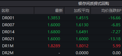 银行间市场回购定盘利率全线下行,FR001报1.5300%,较上日下行27.00个基点;FR007报1.6700%,较上日下行16.00个基点;FR014报1.700%,较上日下行20.00个基点。