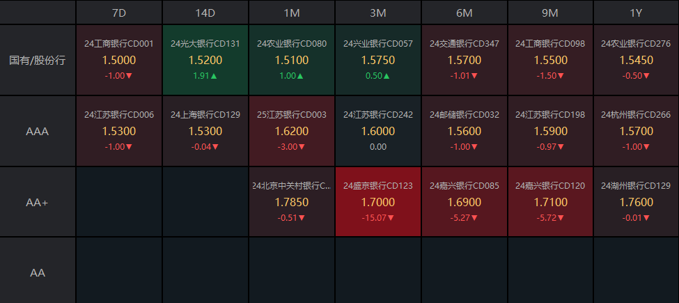 存单方面,今日3M期国股在1.55%-1.61%位置需求较好,较前一日上行0.5bp,1Y期国股报在1.535%-1.57%的位置,较前一日下行0.5bp。AAA级存单方面,9M成交在1.59%,1Y成交在1.57%的位置。