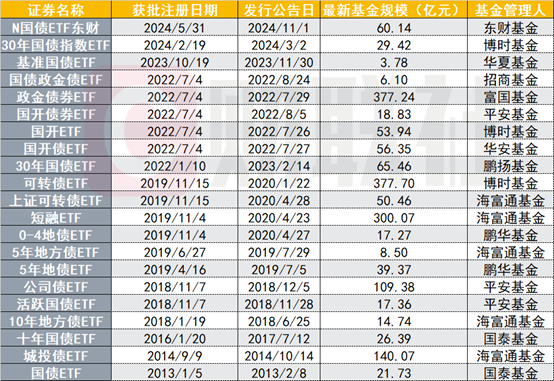 近年,债券ETF审批的进度一直较慢。以近期新成立的另一只债券ETF——国债ETF东财为例,该产品的申请材料于2023年12月1日被接收,2024年5月31日获批,直到11月1日公告发行。国债ETF东财在2024年12月20日成立,顶格募集了60亿元,在债券ETF领域,这一募集规模居前。今日,国债ETF东财上市。