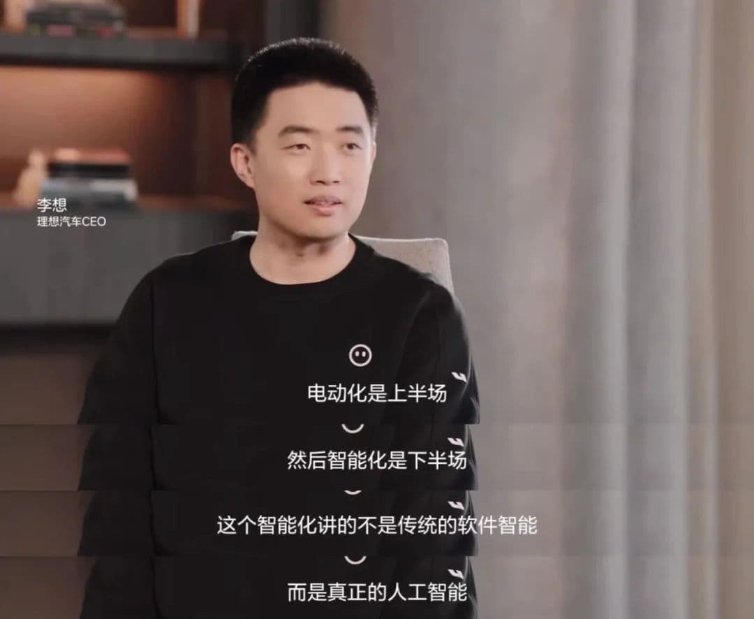 在回应“怎么不想造车,要做人工智能企业”时,李想说,造车肯定是要造的,电动化是上半场,智能化是下半场。