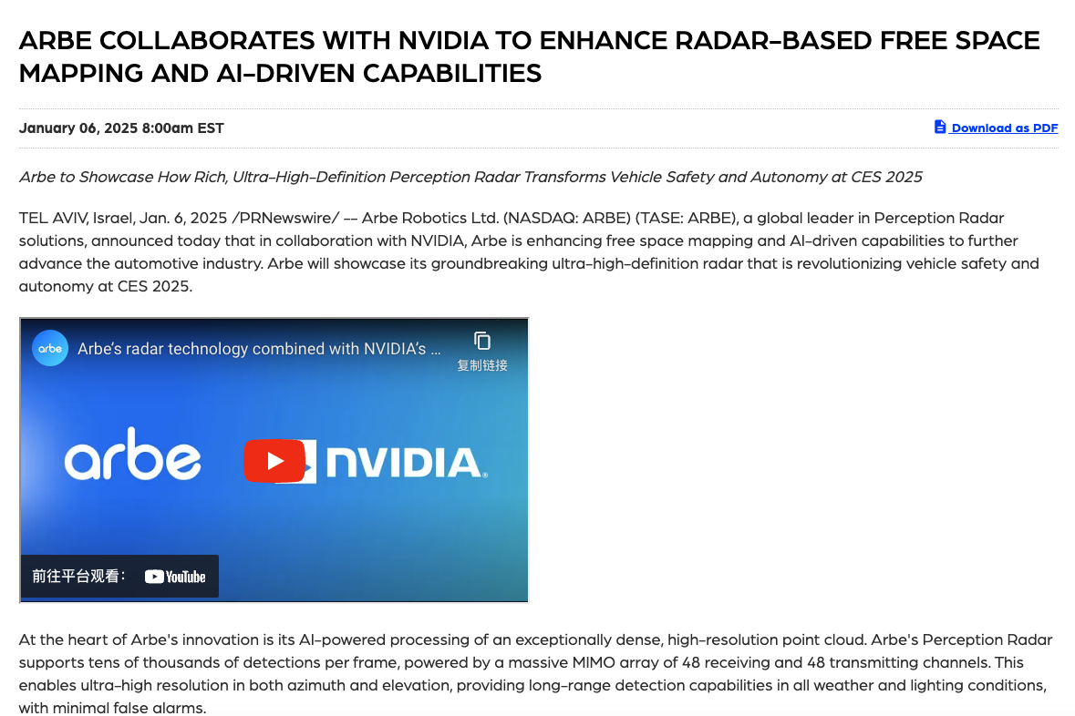 与赛轮思的“剧本”一样,Arbe Robotics周一早晨发公告宣布与英伟达展开合作。公司正在增强自由空间映射和基于AI的能力,并将在本周的消费电子展(CES)上展示其“革命性的超高清晰度雷达”。