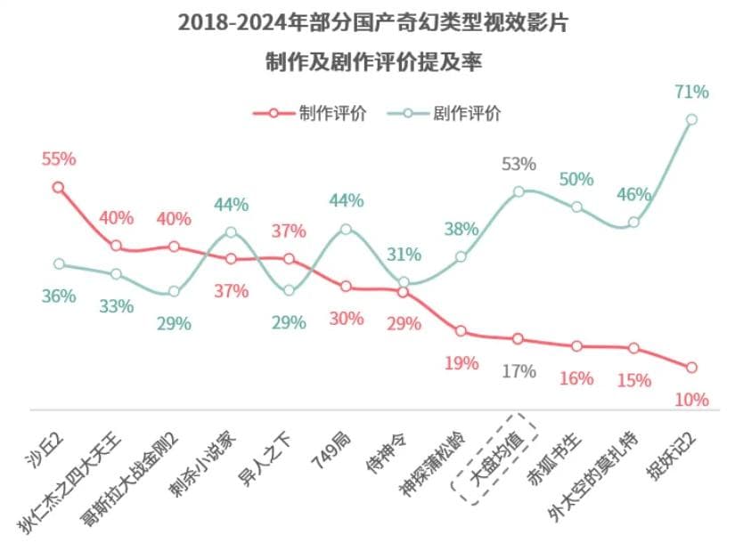 另一方面,类型供给也不应该过度单一化。视效大片一直被认为是冲击头部梯队的重要组成部分,这一部分的影片失去吸引力,对大盘打击是更加严重的。据猫眼,观众对视效影片的评价在过去几年中从制作层面逐步转移到了剧作层面,而视效大片的制作方,还仍然将更多的注意力集中在视效上,相对忽略了剧作的重要性。这是2024年视效大片失落的最关键原因。