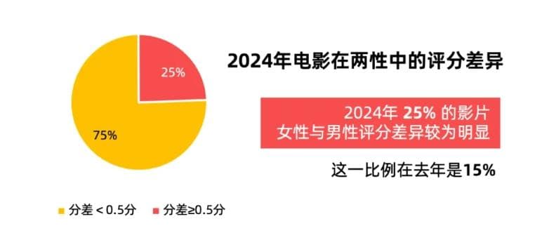 性别分化在今年尤为明显。据灯塔,不仅女性观众的购票占比上升到了58.4%,而且有25%的影片女性与男性评分差异较为明显,这一数据在2023年是15%。