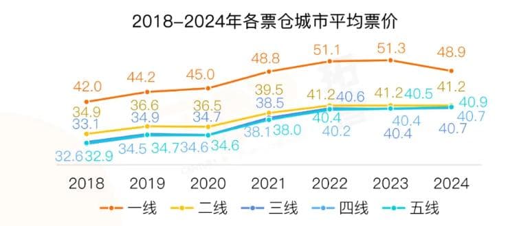而面向观众的变化中,票价更是其中的敏感话题。2024年,是票价变化的一大里程碑——年平均票价比上一年降低了0.2元,除了2020年之外,这是近八年来首次平均票价下降。