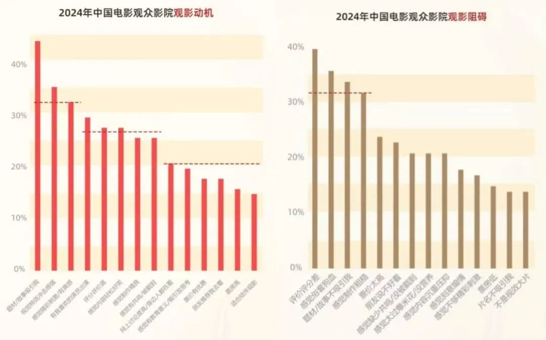 可惜,低票价难以直接成为观众进影院的动力,只是高票价容易成为进影院的阻力。据11月发布的《2024中国电影观众变化趋势报告》,观影动机中,“票价有优惠”仅排在第11位,而观影阻碍中,“票价太高”却能排到第5位。