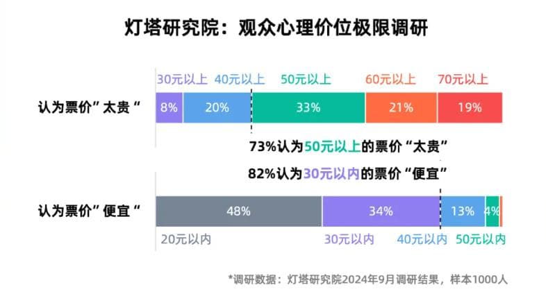 据灯塔调研,93%的观众认为40元以上的票价“太贵”,82%的观众认为30元以内的票价“便宜”,因此《“骗骗”喜欢你》和《火锅艺术家》降价之后维持在32-35元的区间,很难构成“便宜”的心智,只是“不贵”而已。
