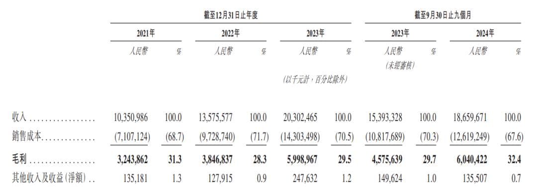 作为公司主体来看,蜜雪冰城在2021年、2022年、2023年以及2024年前九个月,分别实现了136亿人民币、203亿人民币及187亿人民币的收入,同比增长31.2%、49.6%及21.2%。粗略来看,靠给加盟商卖原材料和设备,蜜雪冰城一年就卖出将近200亿人民币。