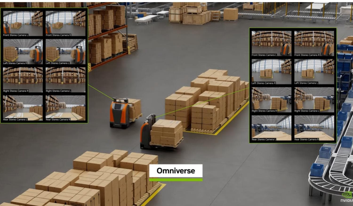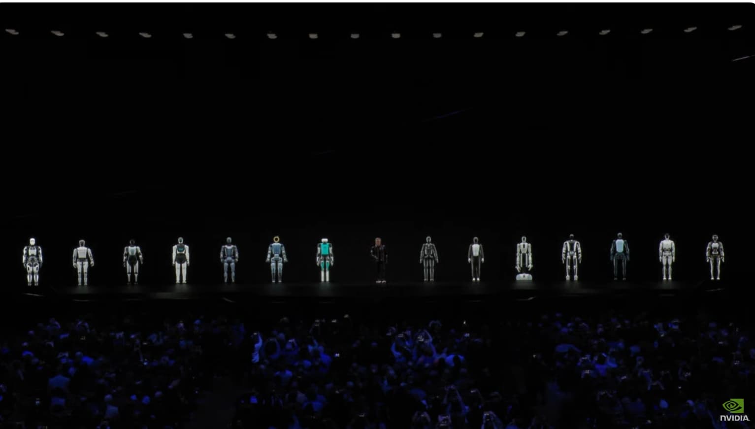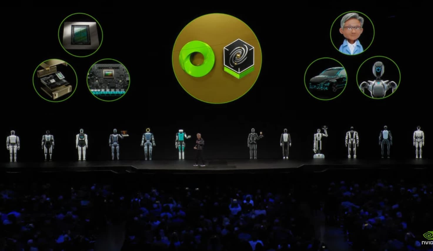 黄仁勋接下来谈到AI机器人。他在大屏幕上展示出了十多款不同公司的AI机器人,并展示英伟达如何协助训练这些AI机器人: