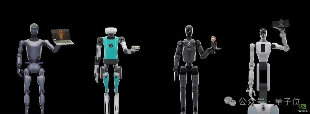 还有比较壮观的场面,就是老黄站在一排机器人的中间,颇有具身智能boom时代的意味。