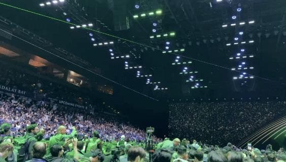 18:42,热场音乐戛然而止,会场霎时从人声鼎沸转为屏息凝神,一段开场视频后,黄仁勋穿了件闪亮的新皮衣,意气风发地走上演讲台,与现场观众寒暄。