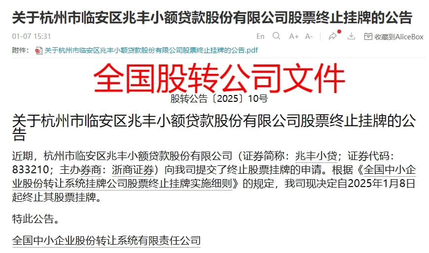 1月7日下午,杭州市临安区兆丰小额贷款股份有限公司(证券简称:兆丰小贷;证券代码:833210)发布公告称,根据《全国中小企业股份转让系统挂牌公司股票终止挂牌实施细则》的规定,公司现决定自2025年1月8日起终止其股票挂牌。而此前该公司股票已于2024年12月11日起停牌。