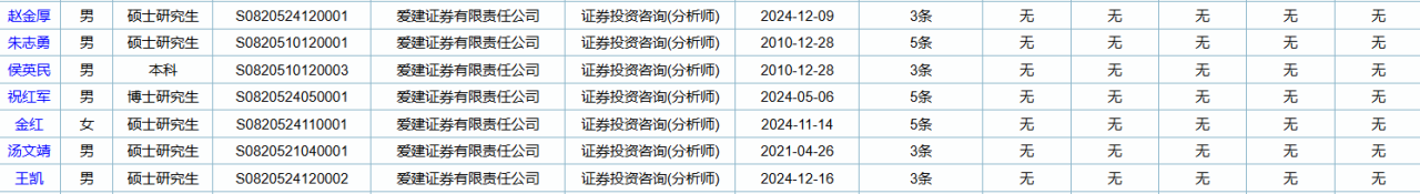 抓眼球的是,卖方研究第一位白金分析师赵金厚已经加盟爱建证券研究所。根据中证协官网,赵金厚的执业注册信息更新在2024年12月。这距离2024年6月退休仅隔半年时间。有业内人士透露,赵金厚是以顾问身份加盟爱建证券研究所。赵金厚拥有27年卖方分析师职业经历,曾在2003-2009年连续7年获得最佳分析师农林牧渔行业第一名,也借此成为史上首位白金分析师。