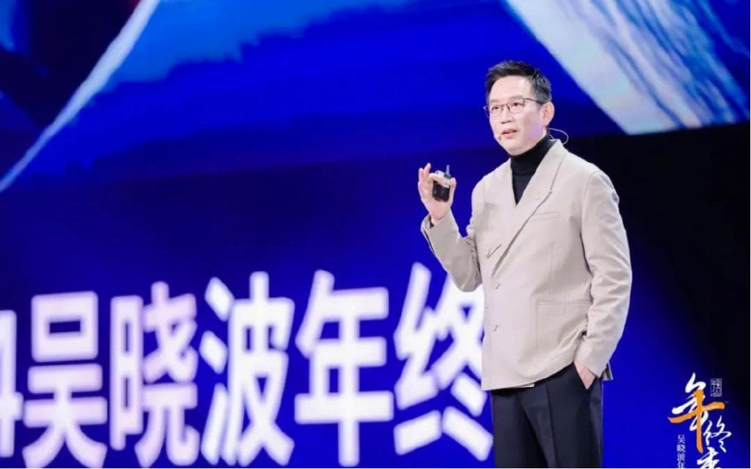 “下定决心过好每一天!”在年终秀现场的巨大屏幕上,吴晓波戴着墨镜和头戴耳机。他正乘坐着陆空一体式飞行汽车前往演讲现场。车体厚重,像是在吴晓波周围筑了一个堡垒。