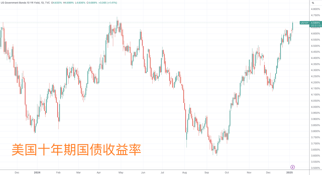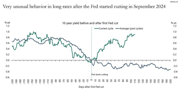 这也意味着自从去年9月开始,美联储降息100个基点的同时,十年期美债收益率上升超过100个基点。