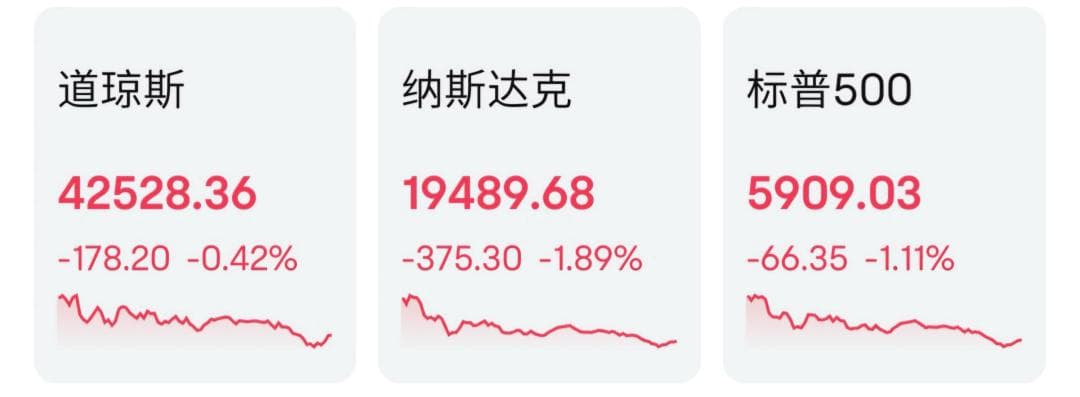 截至收盘,道指下跌0.42%,标普500下跌1.11%,而科技股权重较大的纳指跌幅达到1.89%。英伟达股价重挫超6%,成为当天纳指下跌的最大拖累之一。
