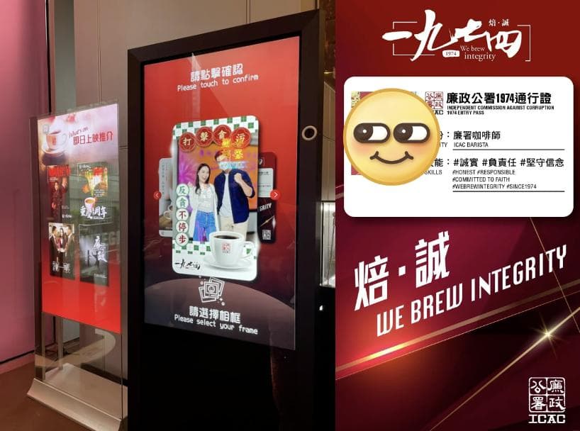 2024年11月,廉政公署「一九七四」咖啡厅正式对外营业,不仅供应性价比咖啡配搭曲奇,更有自动贩卖机出售ICAC文创产品,场内自拍机还有四款限定主题相框,怎么不算港风人生四格。