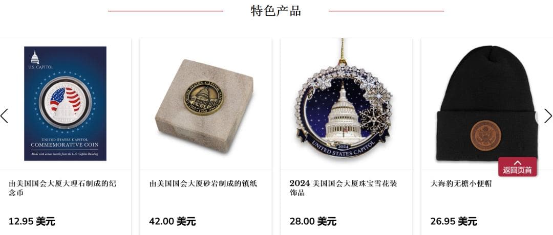 官网介绍,其出售的特色纪念币,“由1860年代前台阶的大理石粉末制成”,这些台阶在1995-1996年国会大厦翻修期间被拆除;