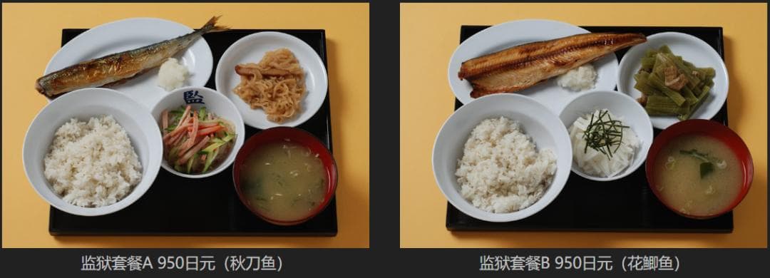 主食是麦饭(麦子3 : 白米7),肉菜是烤鱼(秋刀鱼或花鲫鱼),另有两碟配菜和一碗味噌汤。官网温馨提示:实际上囚犯们的真正午餐里没有味噌汤,而是一碗日式粗茶。