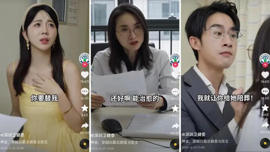比如微短剧界的天降紫微星深圳卫健委,一出《穿越到霸总剧里当怨种医生》,让医生一边对霸道总裁、倔强小白花的狗血戏码大翻白眼,一边在虐恋情深中见缝插针科普医疗知识、传递科学观念,结尾那声嘶力竭的呼吁:“早防、早筛、早治,不要谈癌色变”,就这样深深印在网友心中。