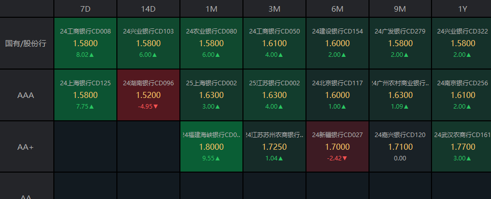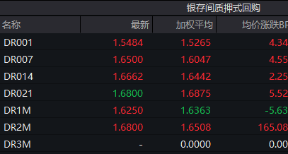 银行间市场回购定盘利率多数上涨,FR001报1.6200%,较上日涨7.00个基点;FR007报1.6300%,较上日涨3.00个基点;FR014报1.6800%,较上日涨8.00个基点。