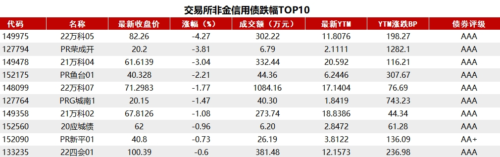 据Choice 数据统计显示,今日交易所市场非金信用债跌幅排行前五的分别是:22万科05、PR荣成开、21万科04、PR鱼台01、22万科07。具体如下: