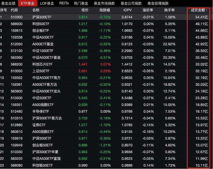 截至收盘,全市场有23只ETF成交额超过10亿,其中,华泰柏瑞沪深300ETF成交量居首,为54.41亿元,华夏科创50ETF、易方达创业板ETF、国泰中证A500ETF、华夏中证A500ETF成交金额超40亿。