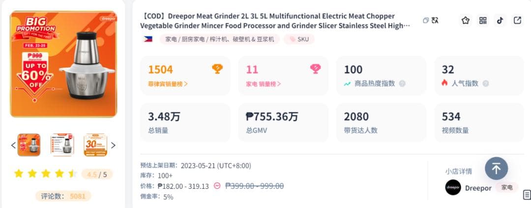 中国的美的、九阳等品牌的空气炸锅,以高性价比、丰富的功能和良好的品质受到菲律宾消费者的欢迎,小米更是排在2023年炸锅销量榜的第二名。FsatMoss数据显示,在10月28日至11月24日的28天里,Dreepor的一款绞肉机在菲律宾的家电-厨房家电类目里销售呈上升趋势,共售出6448件,总销售额达到120.12万。