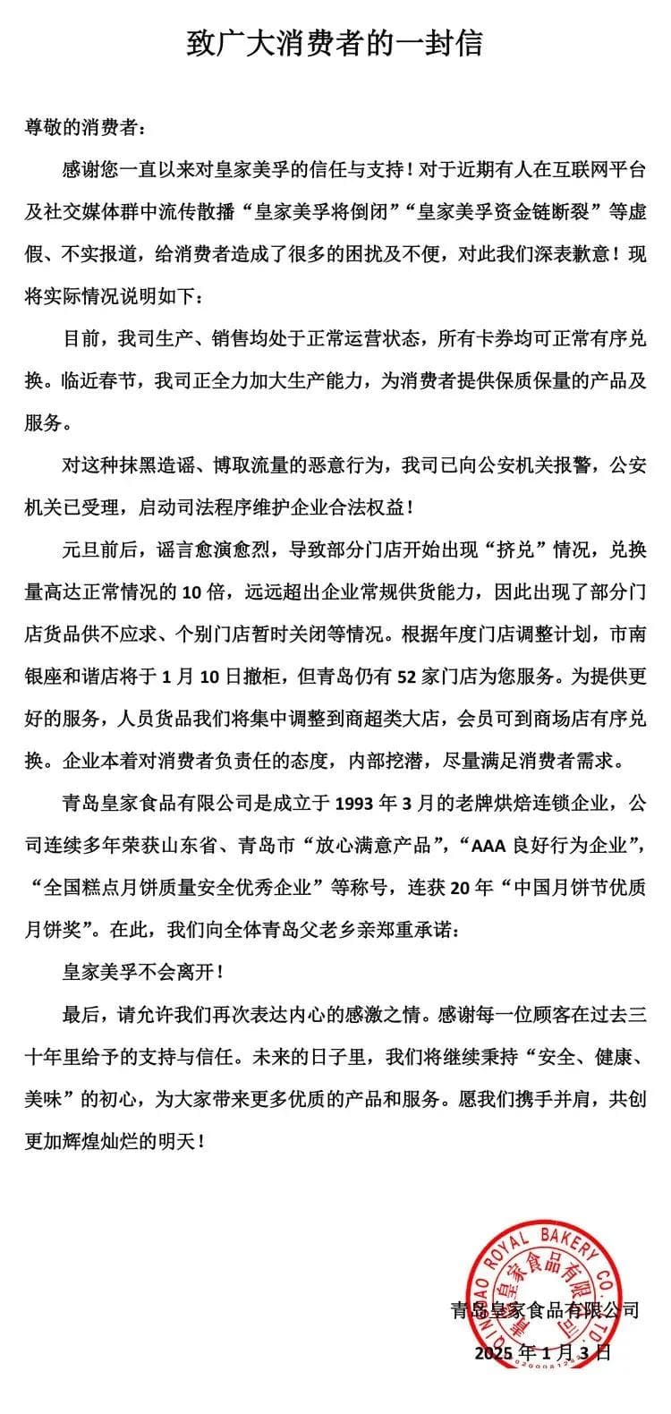 此外,1月3日,青岛皇家食品有限公司总经理姜耀东在大众网的采访中表示,“希望大家不要着急,有序排队,所有卡券均可正常有序兑换。请给皇家美孚一些时间,我们还是希望能保质保量地给市民提供我们的放心产品。”