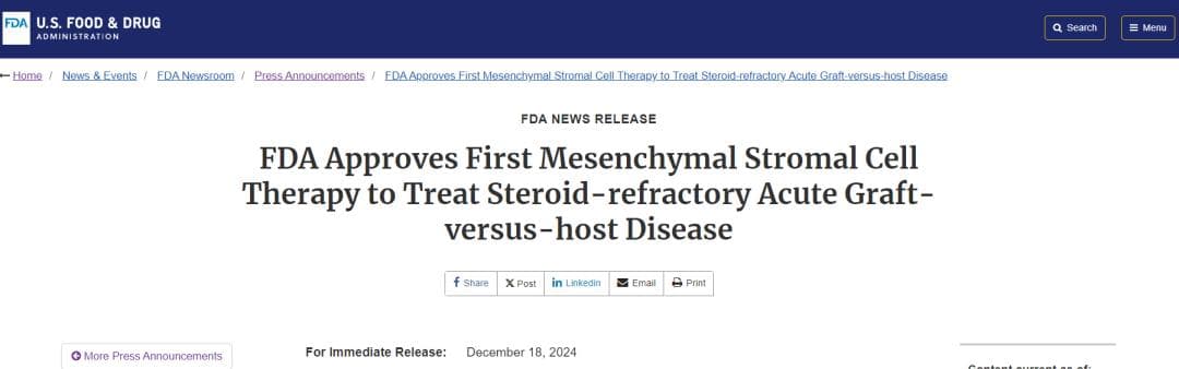 值得一提的是,就在这款干细胞产品获批前不久,在2024年12月18日,美国食品药品监督管理局(FDA)也批准了首个基于间充质干细胞的治疗方法——Ryoncil(Remestemcel-L),该疗法专门用于类固醇难治性aGVHD的治疗。