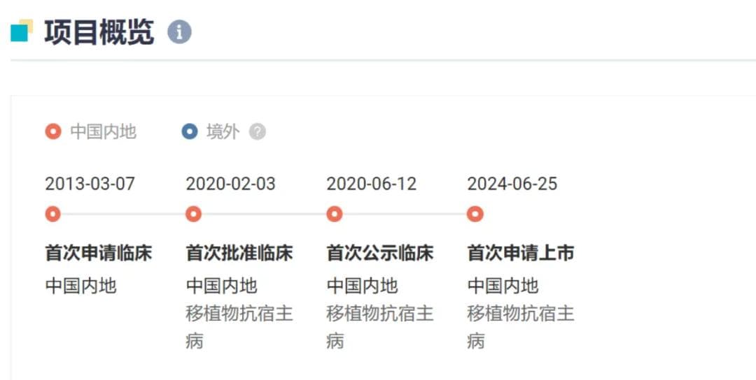 早在2013年3月,该药物的研究者就在国内递交了新药临床研究申请(IND),但彼时受限于监管政策处于萌芽阶段,直至2020年6月才获临床试验许可。之后又历时4年,才于2024年6月被药品评审中心纳入优先审评审批,并于同月25日终于正式递交注册上市申请(NDA),出现在受理队列中。