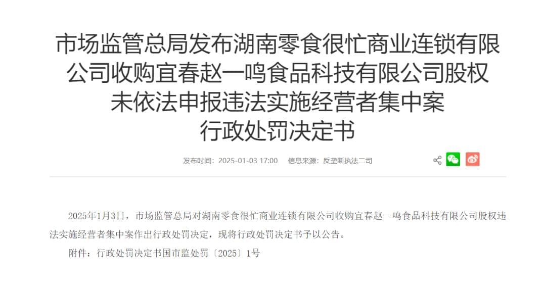 1月3日,市场监管总局发布信息称,湖南零食很忙商业连锁有限公司(2024年5月更名为湖南鸣鸣很忙商业连锁有限公司,简称“鸣鸣很忙”)收购宜春赵一鸣食品科技有限公司股权,未依法事先申报实施经营者集中,被处以175万元罚款。