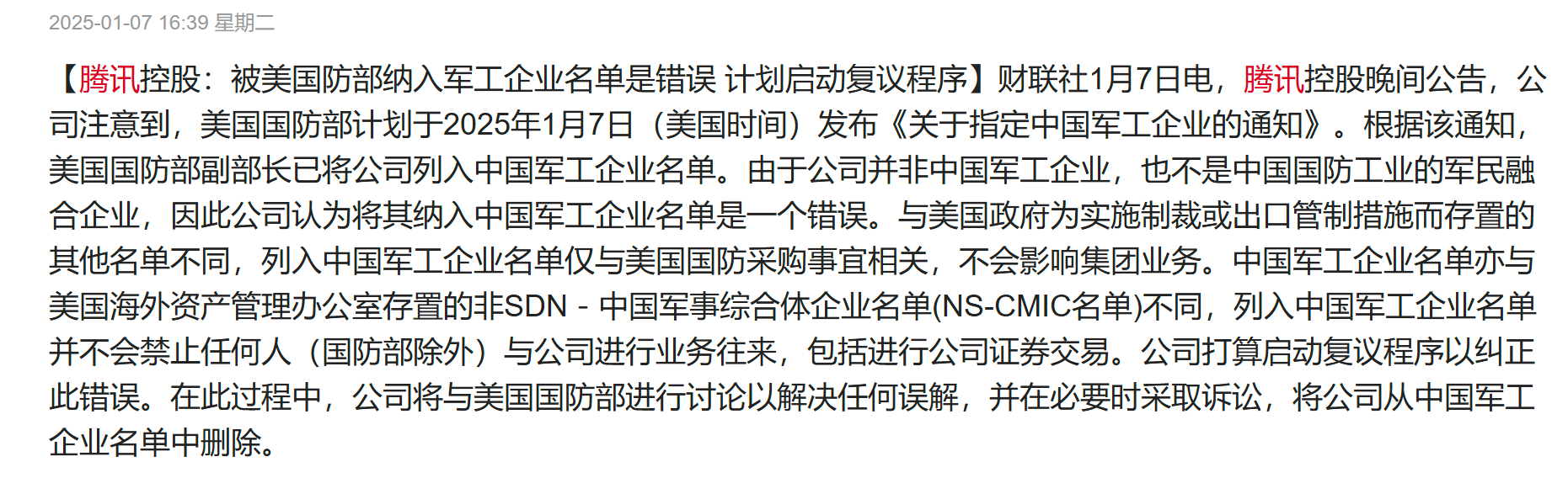 对于这一事件,腾讯在近日发布回应称,美国国防部副部长已将公司列入中国军工企业名单。由于公司并非中国军工企业,也不是中国国防工业的军民融合企业,因此公司认为将其纳入中国军工企业名单是一个错误。与美国政府为实施制裁或出口管制措施而存置的其他名单不同,列入中国军工企业名单仅与美国国防采购事宜相关,不会影响集团业务。