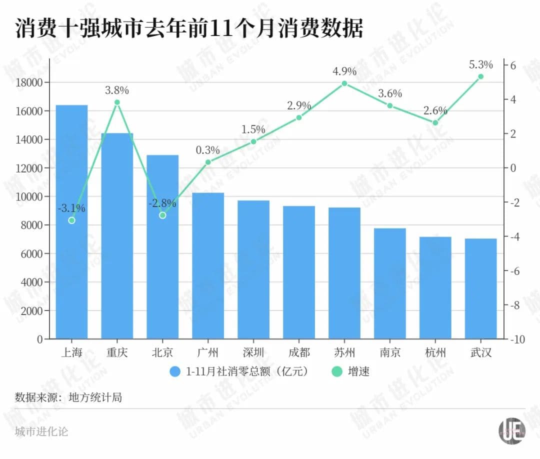2024年我国消费市场平稳增长,前11月份,全国社会消费品零售总额同比增长3.5%。从塔尖城市看,消费十强城市中仅武汉、苏州、重庆、南京四城跑赢全国平均水平,北京、上海出现负增长。