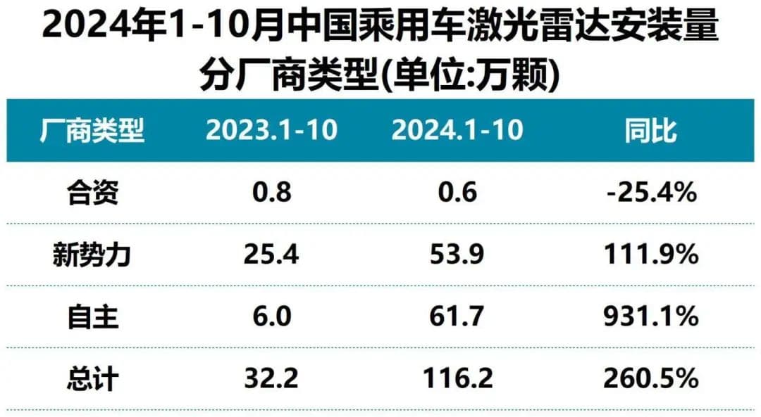 出于智能驾驶领域对激光雷达需求快速增长,2024年1~10月整体装机量达到1145564颗,首次突破单年装机量百万大关。这对于一直唱衰激光雷达的人来说,可能比较难接受。