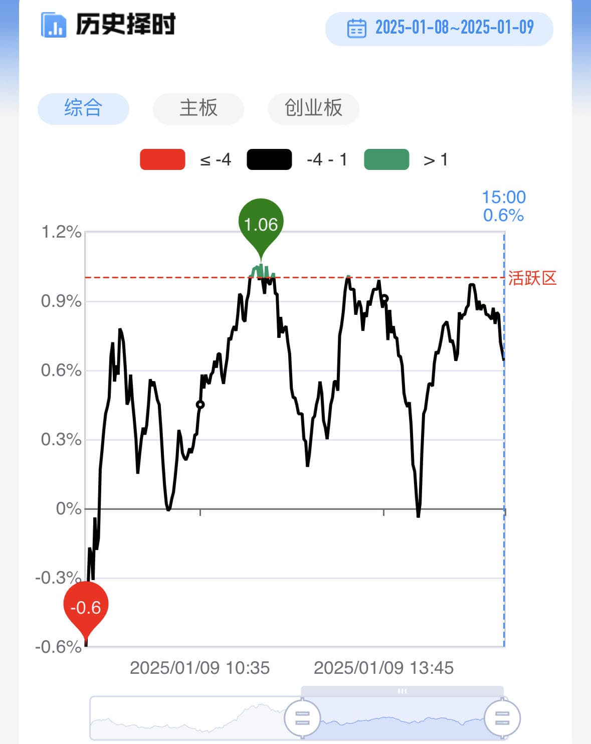 今日短线情绪指标在0轴~活跃区之间反复震荡。