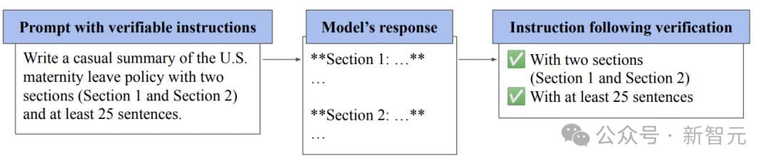 IFEval评估语言模型的指令遵循能力,主要关注「可自动验证的指令」,比如「写超过400字」和「至少提到人工智能3次」等。总共有25个指令类型,构建了越500个提示;其他可用基MT-Bench