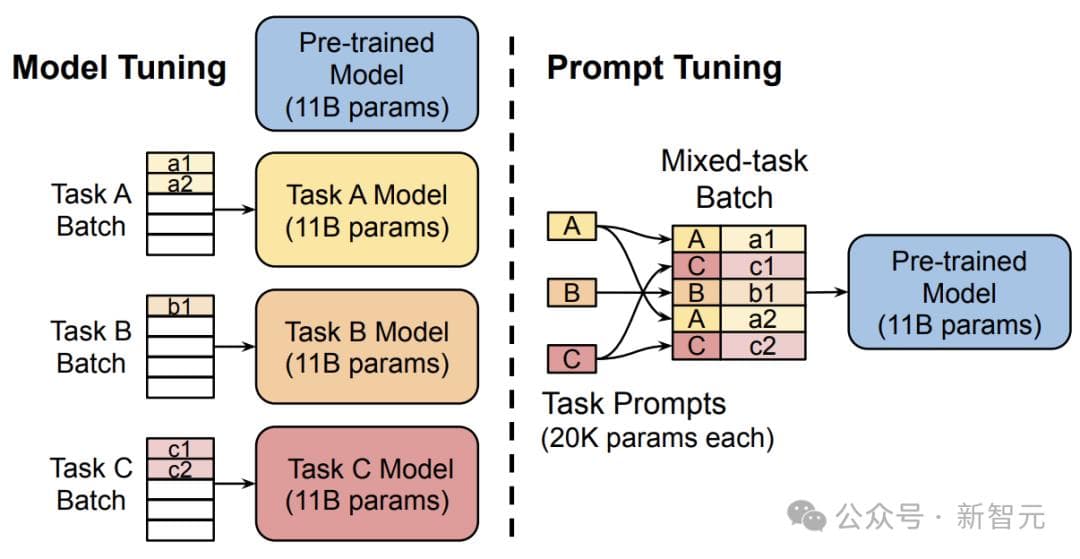 Prompt Tuning不对模型参数进行调整,而是通过反向传播学习「软提示」,可以将冻结的模型用于多个下游任务。