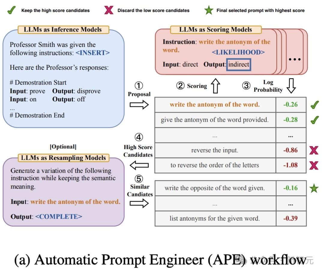 自动提示工程师(APE)能够避免人工编写低质量提示词带来的性能影响,在指令候选池中进行搜索优化,可用于自动生成和选择指令,最终在19/24个任务上实现了比人类标注指令的性能更好。