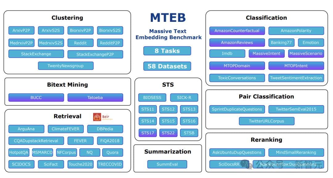 METB是一个大规模文本嵌入基准,包括58个数据集和112种语言,结果是没有某一种文本嵌入方法在所有任务中都占据绝对主导地位。