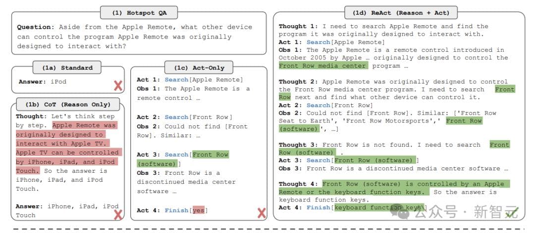 ReAct开启了一系列关于「工具使用」和「函数调用」的研究,通过与简单的维基百科API交互,克服了思维链推理中普遍存在的幻觉和错误传播问题,生成结果比没有推理轨迹的模型更具可解释性。