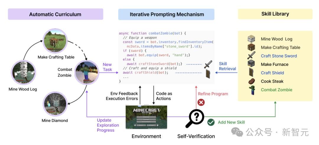 主要包括三个关键组件:自动课程用于最大化探索;一个不断增长的可执行代码技能库,用于存储和检索复杂行为;一种新的迭代提示机制,结合环境反馈、执行错误和自我验证来改进程序。
