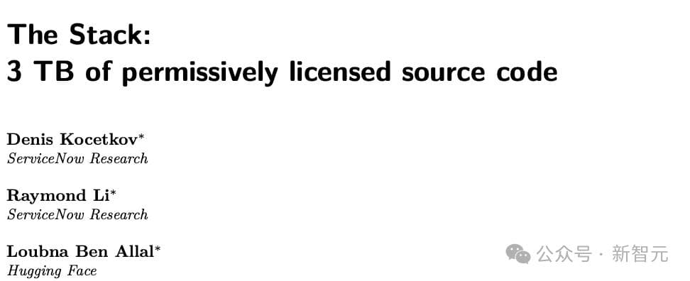 The Stack项目包含30种编程语言的许可源代码,大小为3.1TB,论文描述了数据集的收集过程;通过在不同的Python子集上训练具有3.5亿参数的解码器,展现了根据文本生成代码的潜力,仅使用许可数据就可以达到之前模型在HumanEval和MBPP的性能,后续模型发展为Stack v2和StarCoder