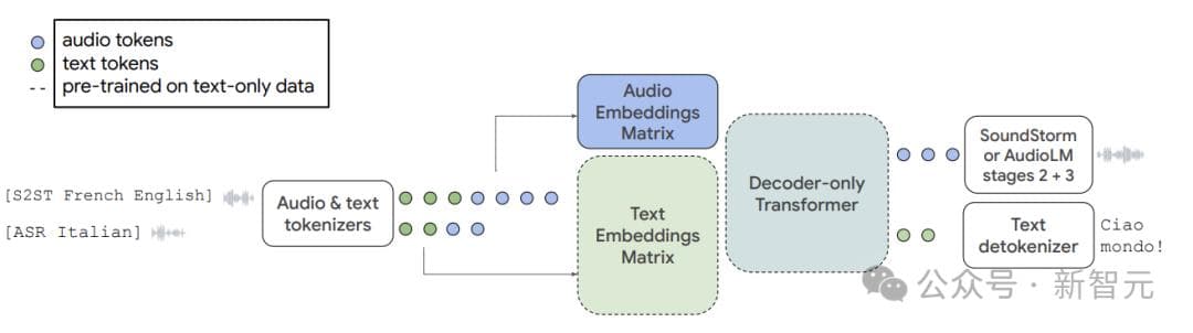AudioPaLM将基于文本(PaLM-2)和基于语音(AudioLM)的语言模型融合成一个统一的多模态架构,能够处理和生成文本和语音,下游应用包括「语音识别」和「语音到语音的翻译」;继承了AudioLM保持副语言信息(如说话者身份和语调)的能力,以及像PaLM-2这样的基于文本的大型语言模型中独有的语言知识。