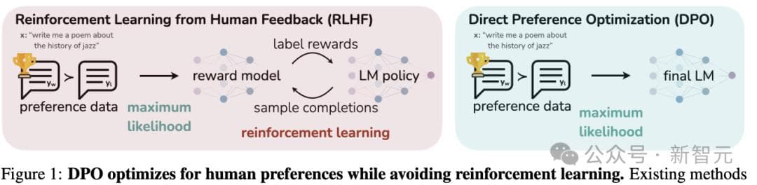 基于人类反馈的强化学习(RLHF)是一个复杂且不稳定的过程,需要先训练一个反映人类偏好的奖励模型,再通过强化学习对大型无监督语言模型进行微调。