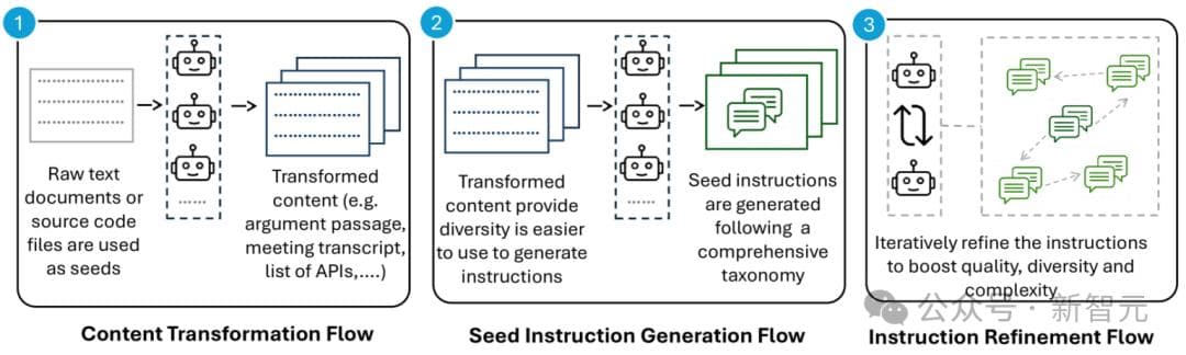 Orca 3-AgentInstruct的研究成果再把这个结论向前推进了一步:开发了一个框架,可以从原始数据源大规模生成多样化和高质量的定制数据集(包括用户提示和模型回复),最终吸能在AGIEval上提高了40%,在MMLU上提高了19%,在GSM8K上提高了54%;论文公开了其中100万个数据对。