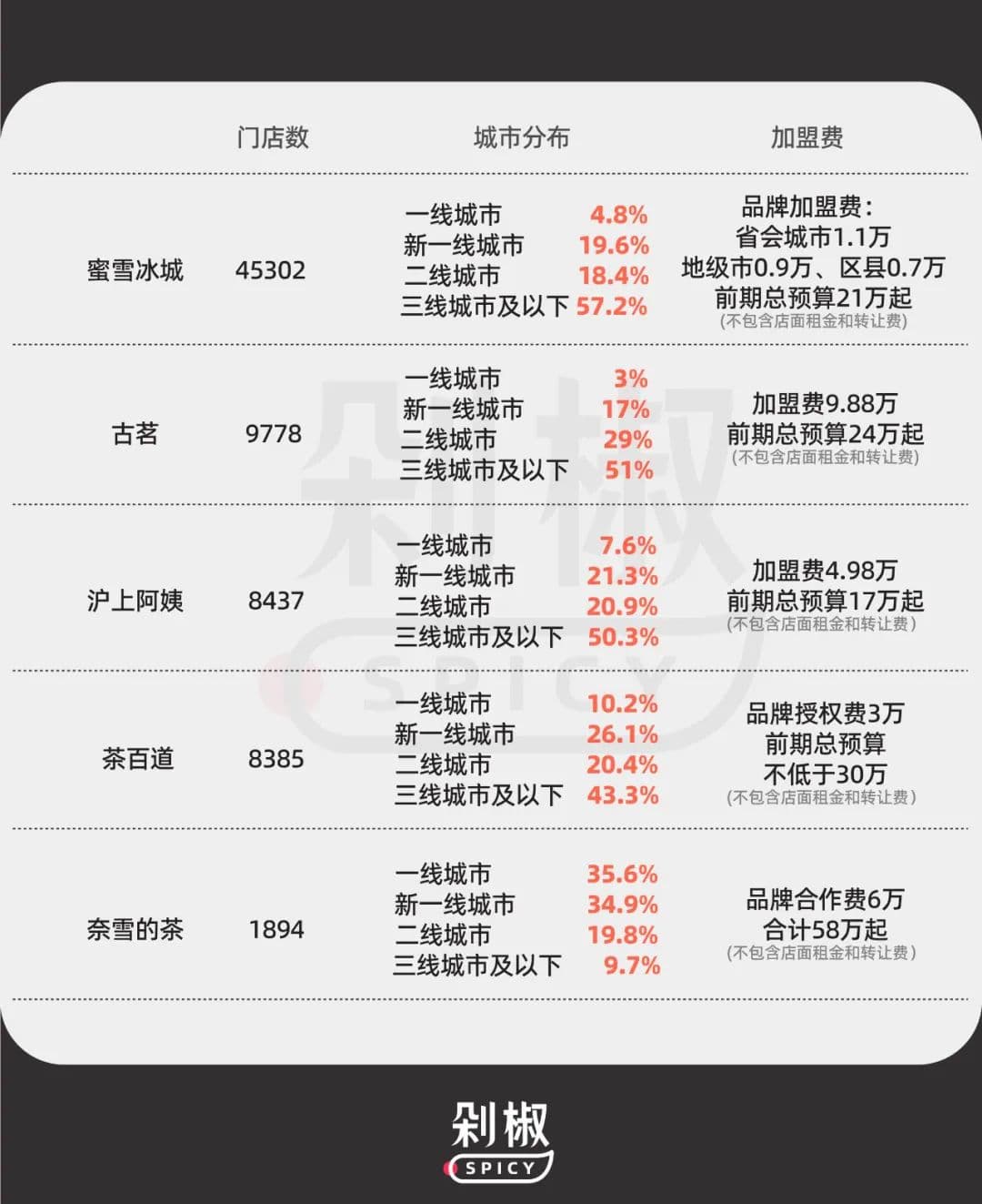如今,各大品牌跑马圈地下,蜜雪冰城等头部品牌点位铺满、加盟也渐渐放缓,或许正如一位业内人士告诉剁椒的那样,“茶饮行业已经没有市场增量了”。