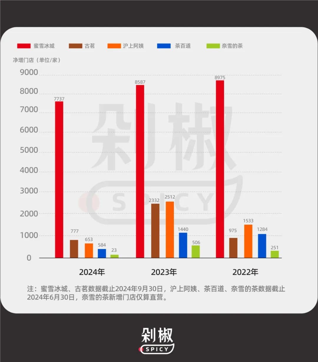 就连一路高歌猛进的蜜雪冰城,拓店节奏也有所调整。即使蜜雪冰城去年前九个月净增门店7737家,但与2022和2023年的8975家、8587家相比,已经有所回落。